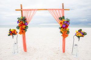 The Island Escape Package brings bright color and relaxed coastal style together for a memorable beach ceremony. Designed with a natural bamboo arch, soft coral fabric, and lush tropical florals, this setup stands out beautifully against the white sand and Gulf waters.